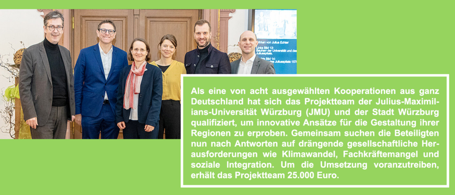 Als eine von acht ausgewählten Kooperationen aus ganz Deutschland hat sich das Projektteam der Julius-Maximilians-Universität Würzburg (JMU) und der Stadt Würzburg qualifiziert, um innovative Ansätze für die Gestaltung ihrer Regionen zu erproben. Gemeinsam suchen die Beteiligten nun nach Antworten auf drängende gesellschaftliche Herausforderungen wie Klimawandel, Fachkräftemangel und soziale Integration. Um die Umsetzung voranzutreiben, erhält das Projektteam 25.000 Euro.